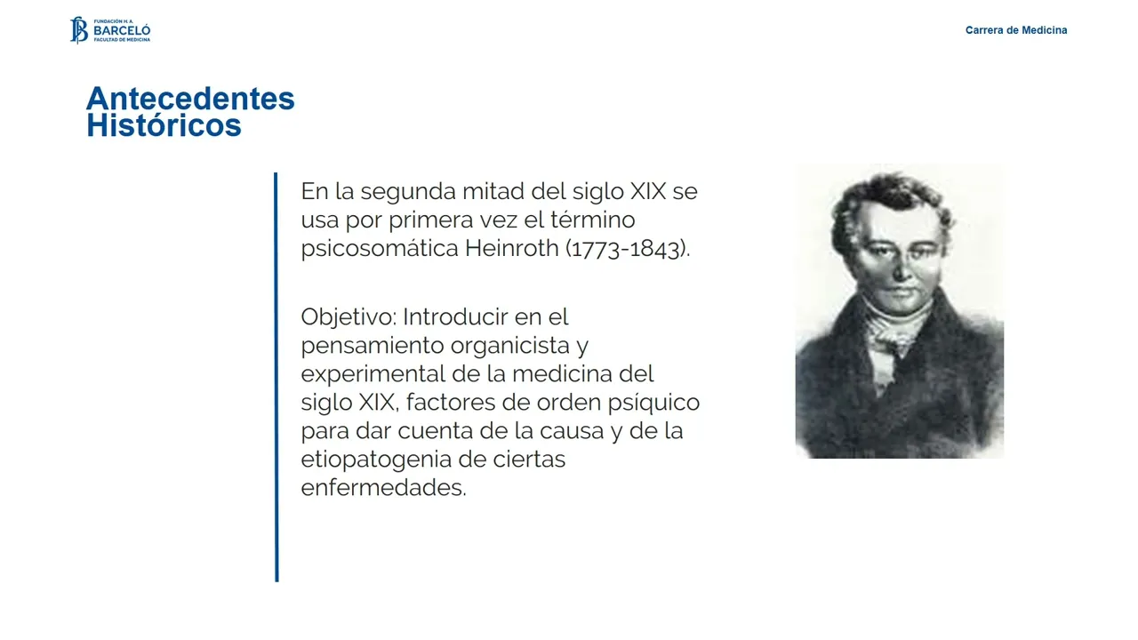 representar una nueva concepción de la medicina donde se tenían en cuenta los factores psíquicos como causantes de las enfermedades orgánicas al médico car gustav carus se le atribuyó el haber descripto por primera vez al cuerpo humano como un campo de expresión de las emociones pero fue con el surgimiento del psicoanálisis cuando definitivamente se pudieron incluir los aspectos emocionales dentro de los factores hetiopatogénicos del enfermar fue Freud quien descubrió la importancia de la palabra como instrumento terapéutico en el tratamiento de la enfermedad y quien demostró la correlación que tenían los sucesos de la vida del paciente