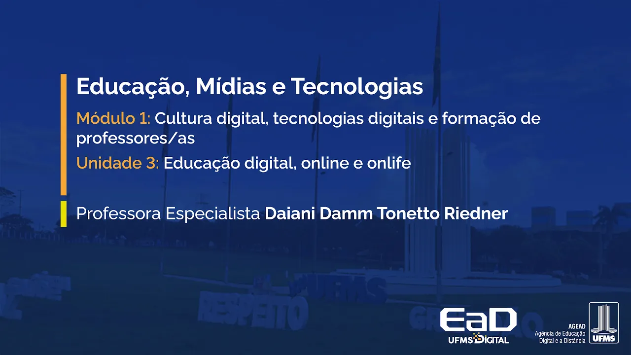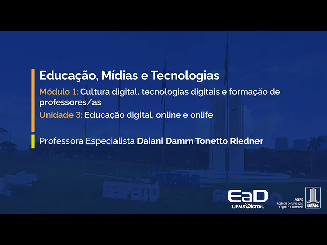 Olá estamos de volta e hoje a gente vai conversar sobre educação digital online e online Isso mesmo é a unidade 3 do módulo 1 que a gente está tratando ainda sobre cultura digital tecnologias digitais e formação de professores vamos lá bom eu quero começar com esse vídeo da professora Eliane Slender para vocês entenderem um pouquinho do contexto da educação digital online Vamos lá ou seja Uma educação online ela é uma educação Que brisa o mundo físico o mundo biológico e o mundo digital possibilitando o embricamento de diferentes modalidades ampliando a ideia que nós temos desses