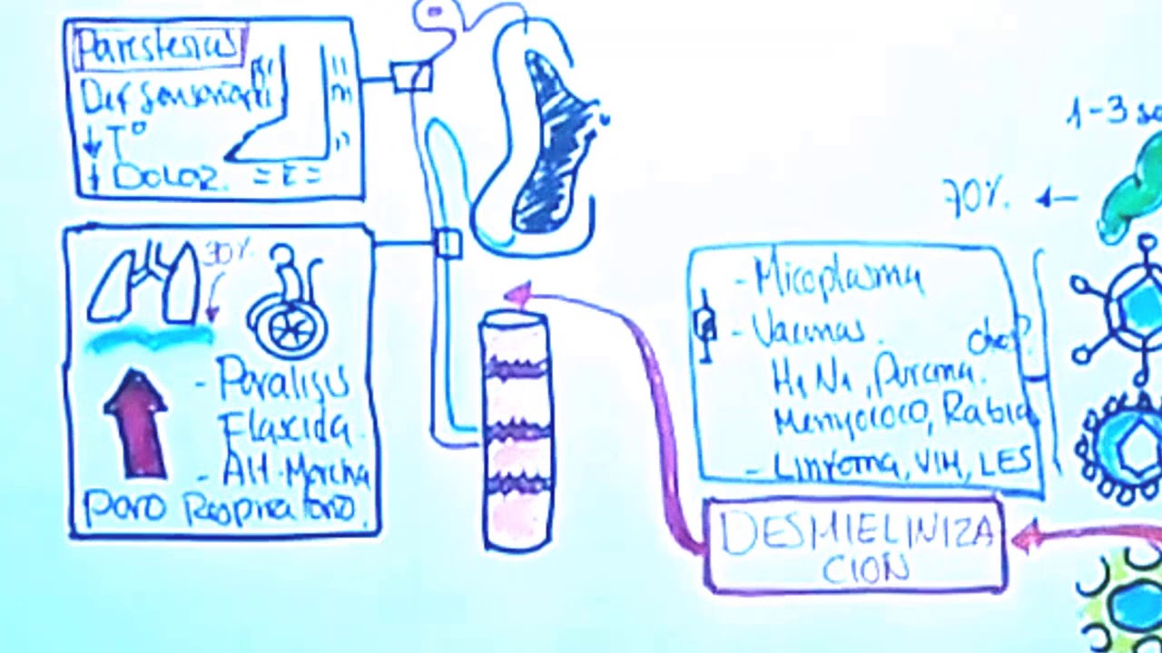 tanto bacterianas como virales dentro de las bacterianas la más importante el patógeno más importante y más frecuente es el campylobacter y la otra bacteria que está en menor medida encontrado es el micoplasma neumonía dentro de los virus se puede encontrar al virus herpes y dentro de esta familia se encuentra al sitio megalovirus y asociado también el virus de epstein otros virus como el VIH el virus de la hepatitis e y uno muy importante que es el virus del zika Asimismo se ha encontrado asociación de esta enfermedad con la vacuna contra la influenza y contra la