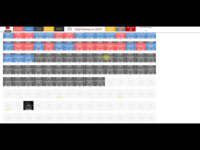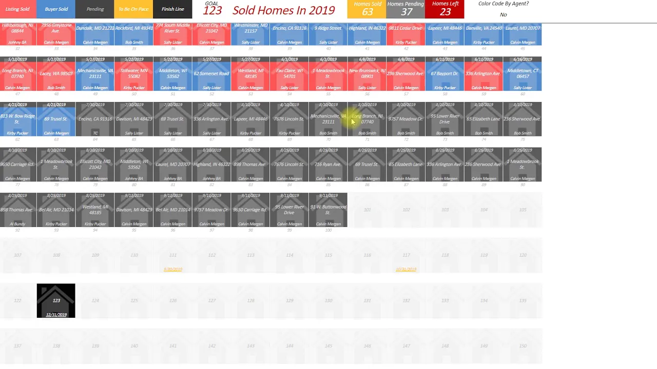 your listings are red your buyers are blue all of your pending contracts are in here as well so you can see exactly where you're at I can see where I need to be at to be on pace each month of the year my goal is to do 123 homes this year by obviously December 31st by September 30th I need to be here October 31st I need to be here November 30th I need to be here so right now my goal is 123 I've sold 63 I've got 37 pending so I have 23 homes left to