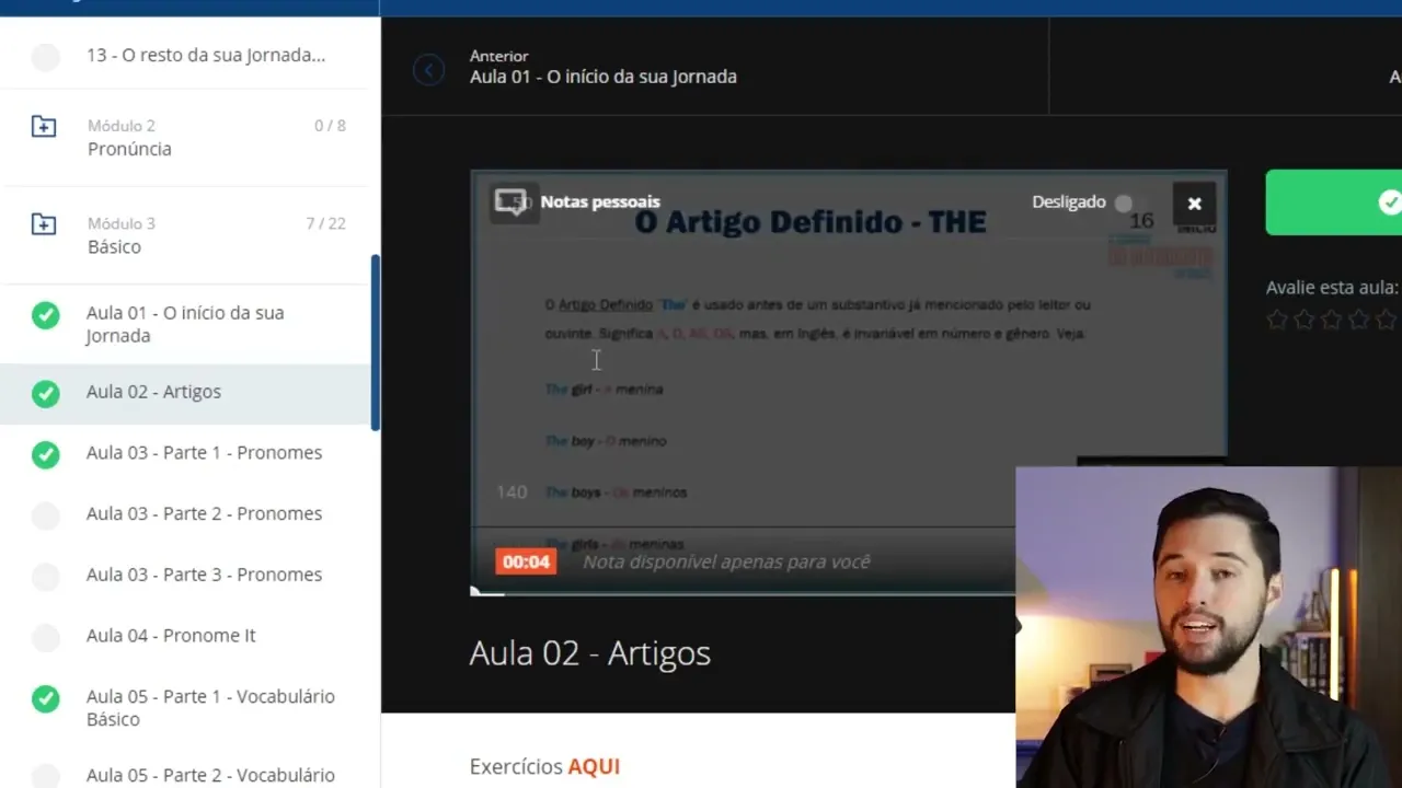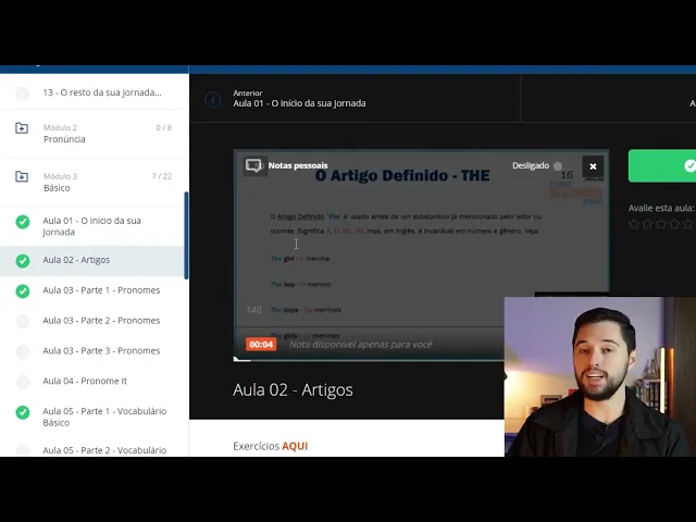 poder entrar no nosso grupo de alunos lá do telegram caso você não tem o telegram precisa baixar o aplicativo lá na sua loja de aplicativos mesmo aqui no módulo 2 Então vai ser o módulo de pronúncia tá é muito importante que você Assista esse modo aqui porque aqui eu dou técnicas por exemplo como pronunciar o th da forma certa como você tem uma pronúncia mais fluida né uma conversa mais fluida aí Aqui nós temos os módulos básicos intermediário e avançado eu vou abrir por exemplo aqui aula 2 de artigos você pode clicar no vídeo ele