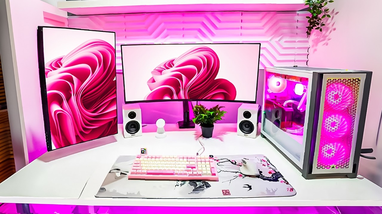 now we've literally got two monitors and a ver this is going to look so good but we're missing one thing and that is the PC oh God it's actually quite heavy be really careful now and not drop this down the stairs I hope this fits on the desk you know oh my God that is perfect oh my God that's perfect Pikachu can oh that's kind of that's that's hard that is [Music] hard never mind now that the PC and the monitor are in the setup it was time to add all the other little accessories that