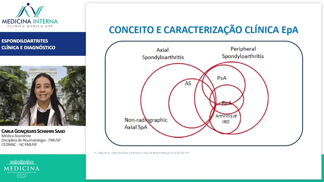 Olá meu nome é Carla Gonçalves chain Saad eu sou médico assistente já disciplina de reumatologia do Hospital das Clínicas da Faculdade de Medicina da USP e sou atual coordenadora do centro de infusão de doenças autoimunes né que fica no sexto andar do [ __ ] e que hoje né assiste todos os pacientes em uso de imunobiológicos da reumatologia Então fui convidada né primeiro Agradeço o convite para dar essa aula do artrites para vocês e falar um pouquinho da Clínica e do diagnóstico desses pacientes quando a gente fala de Esponja ou artrite a gente tem que