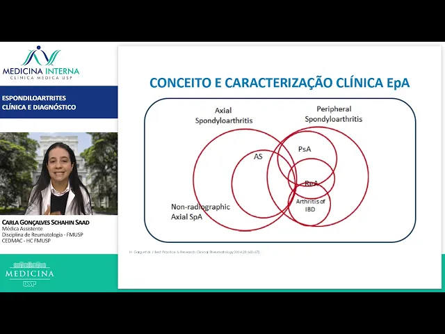 aqui os principais patologias que a gente já comentou então responde gente ignorante reativa as artrites anteropáticas e as responsabilidade indiferenciadas quando a gente olha né direito e a caracterização a gente vê que a gente tem doenças que tem um predomínio de manifestações axiais e outras que tem um predomínios mas tem pensações periféricas e a gente tem algumas doenças que tem uma intersecção que tem sintomas axiais e sintomas periféricos Associados então dentre um predomínio de sintomas axiais a gente tem o carro chefe que é espondilite anquilosante e o novo conceito que são as esponjas artrites axiais
