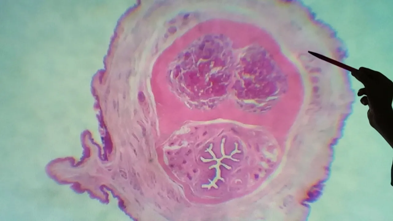 maiores aqui em volta a gente pode observar na lâmina agora a pele que é uma pele bem fina e bastante rogada é exatamente para permitir a aeris que durante a agressão ela se estique mostrando aqui eu vou mostrar um aumento maior aqui é só pra gente ter uma noção dele como um todo mas ele vai ser totalmente revestido por uma pele que é muito fina que a gente vai ver depois em aumento maior que ela também vai apresentar e e derme e epiderme porém não vai ter poder me com com tecido adiposo vai estar unida