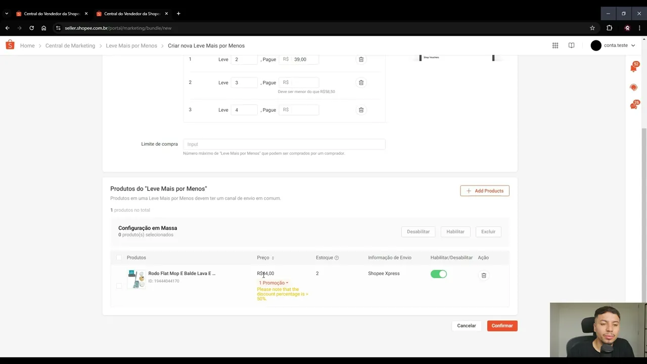 de compra né então se o cliente comprar duas três unidades É melhor ainda então não faz sentido a gente limitar para por exemplo um assim o cliente só vai poder comprar uma unidade e a gente quer vender né Então dessa forma você vê que eu coloquei 10% para todos os produtos então tenham atenção na precificação de vocês para nem colocar um desconto que ainda assim o produto fique caro e também nem colocar um desconto que você tome juo Então tem que ter muito cuidado feito isso vamos clicar aqui em confirmar e pronto e agora vamos