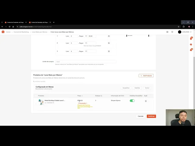 e tem que escolher exatamente o produto certo então vamos lá eu vou escolher aqui esse Mop o que eu tô querendo dizer Esse Mop Ele custa R 64 eu tô querendo dizer que se o meu cliente levar dois mops ele vai pagar por exemplo R 55 em cada um então já deu para ver que aí você precisa ter muito cuidado porque se você não tiver total controle ali do que de do quanto isso impacta você pode tomar muito prejuízo então eu não recomendo muito esse formato Porém você pode fazer se você entendeu aqui bem como