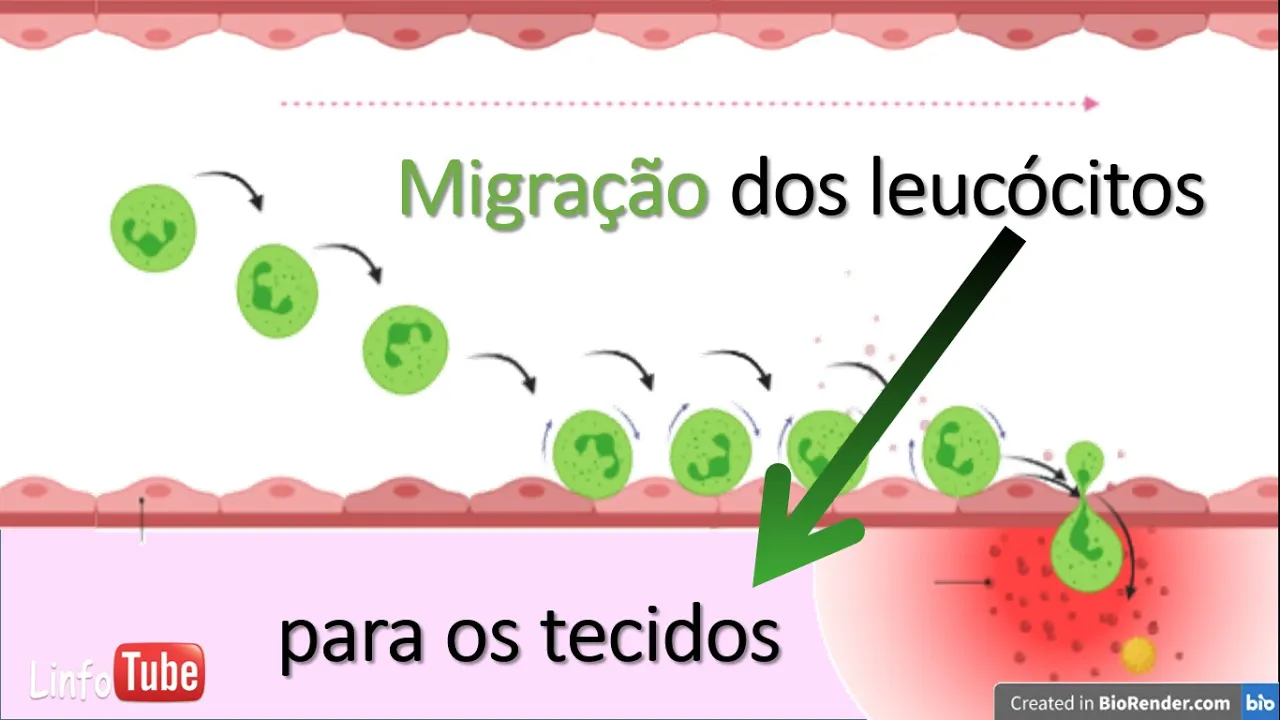 que a inflamação é um processo natural do nosso sistema imunológico e que ela acontece sempre que há necessidade de combater algum agente invasor embora possa acontecer também em outras situações como nós vamos ver mais tarde né isso tudo a g o nosso organismo é importante também lembrar que as células do sangue são os leucócitos ou glóbulos brancos os eritrócitos que também são chamados de glóbulos vermelhos ou hemácias e as plaquetas os leucócitos são os neutrófilos monócitos linfócitos eosinófilos e mastócitos basófilos dentre várias outras cenas então aqui falaremos sobre a migração de leucócitos que são as