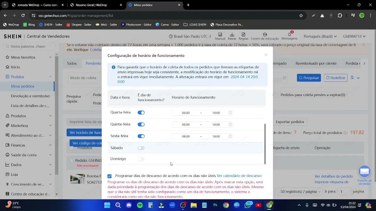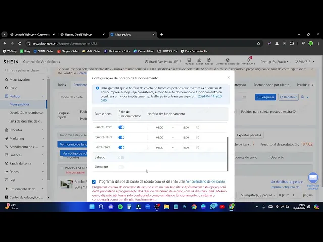 E aí pessoal nessa aula eu vou est explicando para vocês como que a gente faz para poder est ativando as coletas Shen aos sábados é bem simples mas eh eu resolvi gravar para poder mostrar para vocês vocês vão clicar aqui em pedidos meus pedidos ver horário de funcionamento aqui vocês vão clicar em modificar o seu o de vocês aí vai estar ativo de segunda a sexta e esse Sábado aqui vai est assim ó desativado então vocês vão clicar em ativar o sábado aqui de 8 às 16 não tem como colocar menos e aqui ó vai