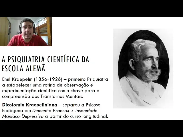 oi e aí nós vamos para o próximo momento desse breve histórico da psiquiatria a psiquiatria científica de escola né esse que tá aí é o emil kraepelin que é considerado por muitos um dos grandes ou principal representante desse momento da história da psiquiatria esse é o momento da história em que muitos psiquiatras vão propor métodos científicos métodos empíricos para a classificação diagnóstica na psiquiatria a classificação naquele momento era uma classificação muito baseado em relatos muito baseado em muitas ideias que as pessoas tinham muito baseadas em coisas que não eram experimentar fez e a escola alemã