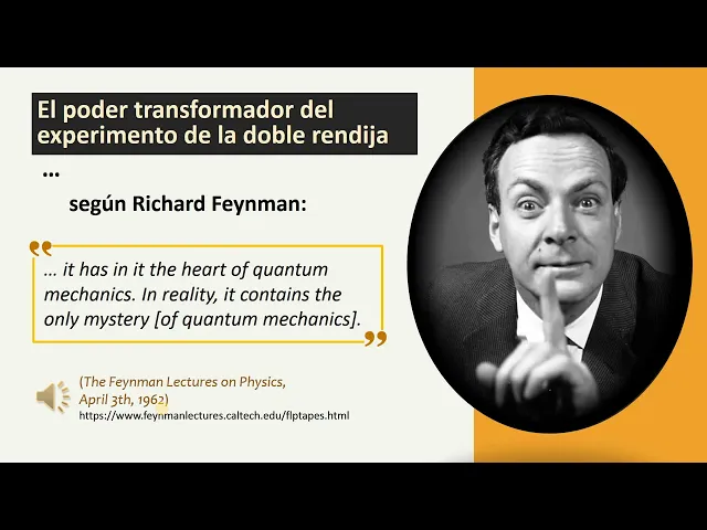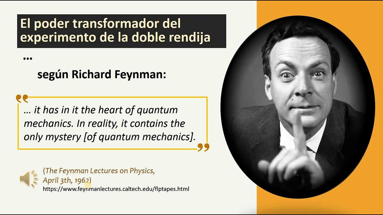 el título de la charla hay una coletilla los misterios de la mecánica cuántica esto es porque Además este experimento ilustra muy bien algunos de los conceptos fundamentales y Normalmente considerados más misteriosos de la mecánica cuántica sobre esto voy a citar a un físico muy popular llamado Richard feyman Por cierto las citas que tomé que he copiado directamente del inglés las he puesto en inglés pero como lo voy a explicar todo lo que aparece no Debería ser mayor problema para nadie decía que esto lo dijo feinmann como parte de un curso muy famoso que impartió un