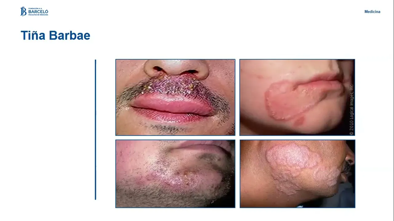 al hombre adulto en la zona y región de la barba y bigote se opción a bastantes trabajadores rurales tienen una clínica similar adquirió en cuanto a lo que es los operativos por eso la característica anatomopatológicas está dada por una foliculitis postularlo inflamatoria a veces con una infección secundaria por estafilococos y el tratamiento es similar a el que se indica para la línea capitis ahí tenemos algunos ejemplos justamente de esta línea barba e como será denomina la del cuerpo o corporis afecta justamente el indicativo de su nombre todo lo que es troncos extremidades puede afectar cualquier