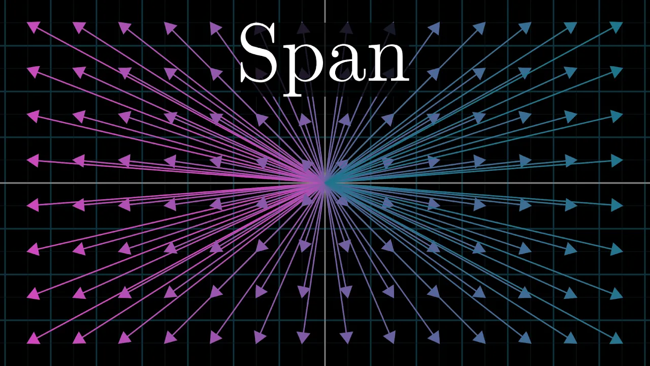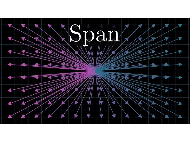 For example, if you take two vectors in 3D space that are not pointing in the same direction, what does it mean to take their span? Well, their span is the collection of all possible linear combinations of those two vectors, meaning all possible vectors you get by scaling each of the two of them in some way and then adding them together. You can kind of imagine turning two different knobs to change the two scalars defining the linear combination, adding the scaled vectors and following the tip of the resulting vector.