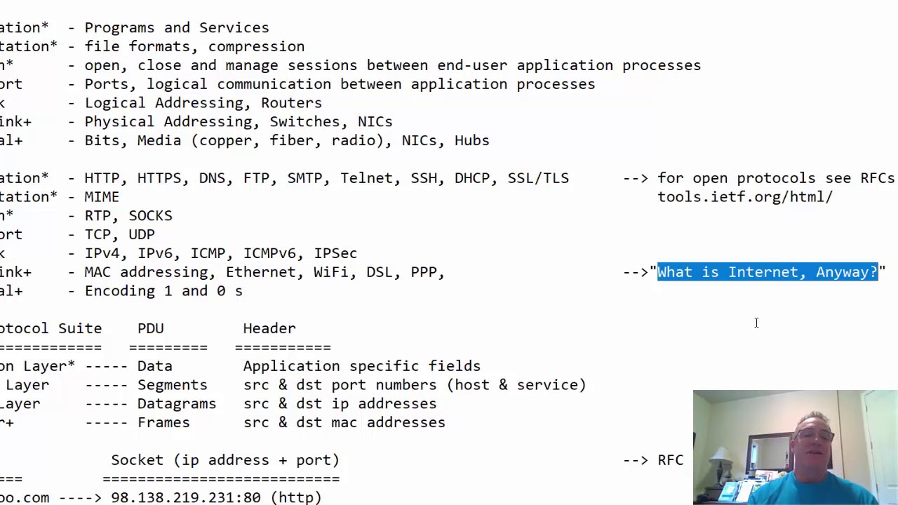 the transport layer it gets broken up into pieces and the transport layer header is added on and then the network layer the network layer header and then the data link layer the ethernet frame header and then the physical layer it's turned into ones and zeros and then it goes over the wire as ones and zeros electrical pulses of electricity on the wire when it goes back and reaches its destination it goes back up the model and gets turned back into data and gets you know viewed by the user that requested it or it gets to