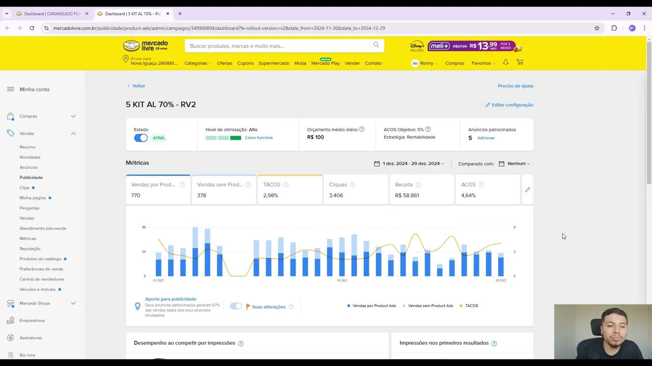 você vê que gastou R 10 e não vendeu nada você já desespera Mas isso é porque o algoritmo tá trabalhando tá começando a entender o seu produto e onde vai colocar então de tempo ao tempo e outro aspecto também é ficar de olho no posicionamento do seu anúncio saber em que posição o seu anúncio tá comparado com os vendedores concorrentes então o eds tem que ter um objetivo você tem que ter o objetivo de melhorar sua seu posicionamento aumentar o seu faturamento ele tem várias coisas que vai te proporcionar só que você primeiro tem que