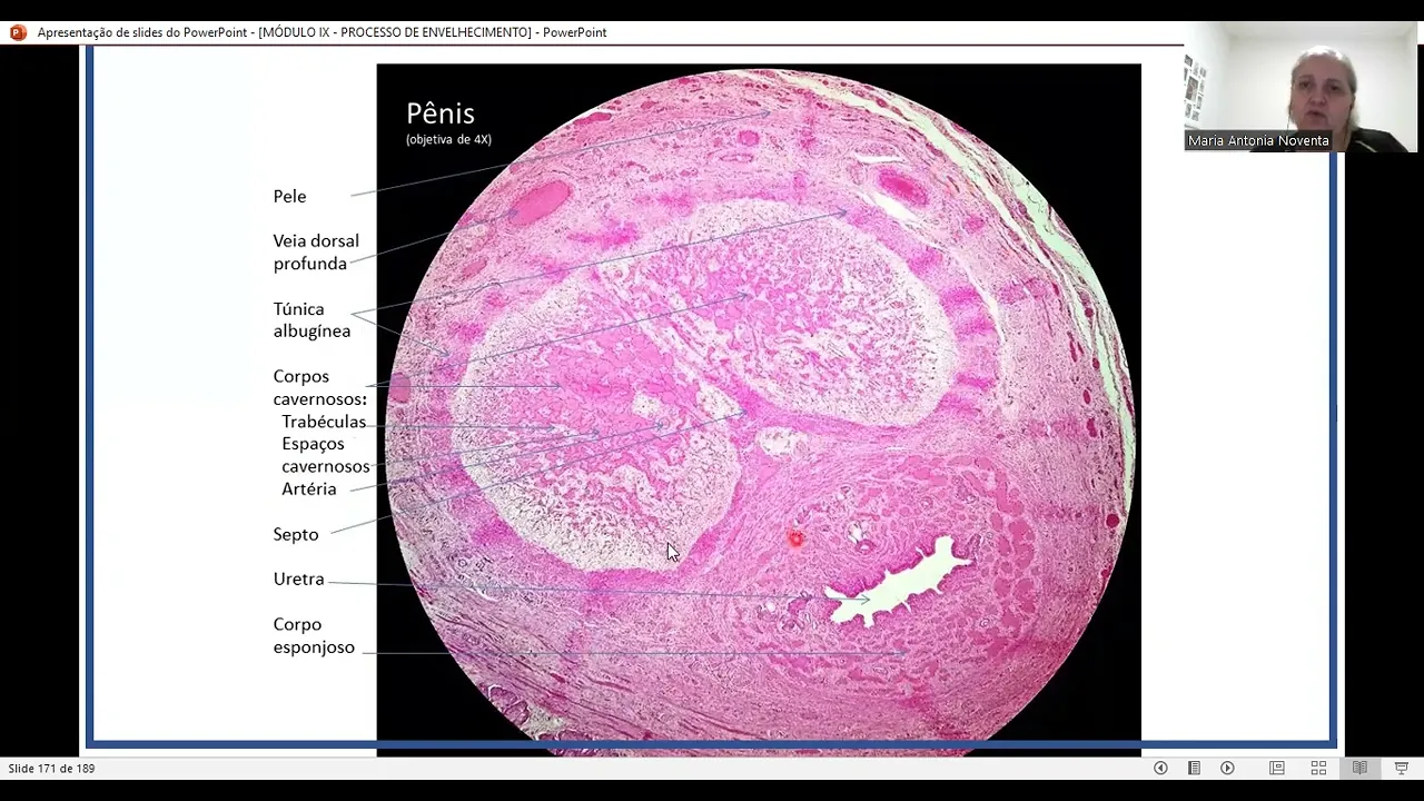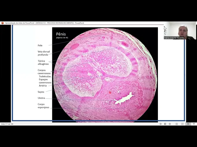 um homem idoso né com a chamada hiperplasia prostática mais pra frente né no módulo 10 lá que é o módulo de carcinogênese a gente vai falar da do câncer de próstata né então é bem importante que vocês vejam direitinho a istologia do da da próstata normal né Para que vocês possam depois observar as as alterações que são provocadas pelo carcinoma né da da próstata Então vamos lá bom eh se eu não me engano essa é uma lâmina que vocês nunca viram é uma lâmina nova né é uma lâmina de pênis eh e essa imagem é
