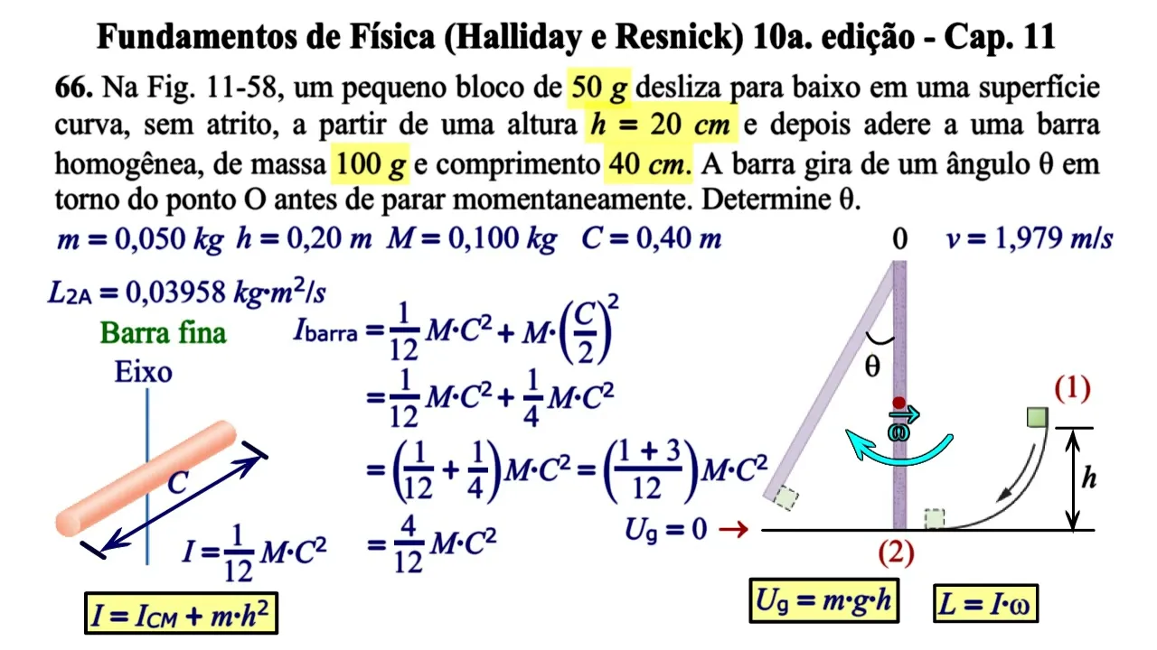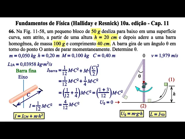 nesta série de aulas vamos resolver os problemas do Capítulo 11 do livro fundamentos de física de Harley e resnick décima edição problema 66 na figura 1158 um pequeno bloco de 50 gramas desliza para baixo em um superfície curva sem atrito a partir de uma altura h = 20 cm e depois adere a uma barra homogênea de massa 100 gramas de comprimento 40 cm a barra gira de um ângulo teta em torno do ponto o antes de parar momentaneamente determine teta Primeiro vamos escrever as medidas informadas no problema nas unidades padrão de medida a massa do