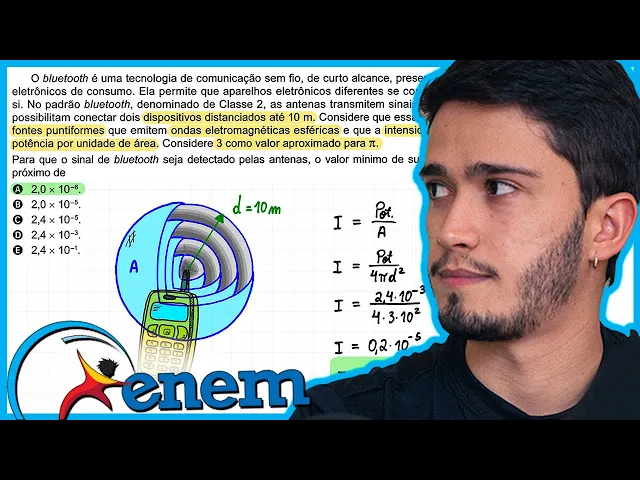 Olá seja bem-vindo ao canal phisique eu sou o professor Thales e eu te ensino tudo sobre física para sua aprovação vamos resolver essa questão da prova do Enem de 2023 e se você não conhece a questão ainda dá um pause no vídeo e tenta primeiro resolver sozinho ou sozinha bom a questão fala sobre um aparelho que emite um sinal bluetooth e que o Bluetooth nada mais é do que uma onda Eletro magnética tridimensional ou seja ela se propaga para todas as direções do espaço ele deixa isso bem claro aqui ó ela pode ser considerada essa