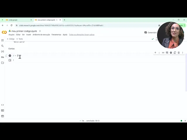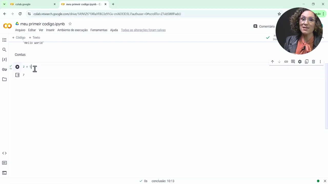 já retornou para mim o número sete então ele fez um cálculo simples porque afinal de contas ele é como se fosse um Word um pouco mais inteligente bom vamos seguir um pouco mais eu vou criar mais uma informação eu posso colocar essa informação logo abaixo do 2 + 5 continuando a minha informação por exemplo ou eu posso simplesmente acrescentar mais uma linha ou seja mais uma célula para você entender lá na frente a gente vai fazer alguns comandos um pouco mais evoluídos E aí cada vez que eu clico no no Play ele executa aquela célula