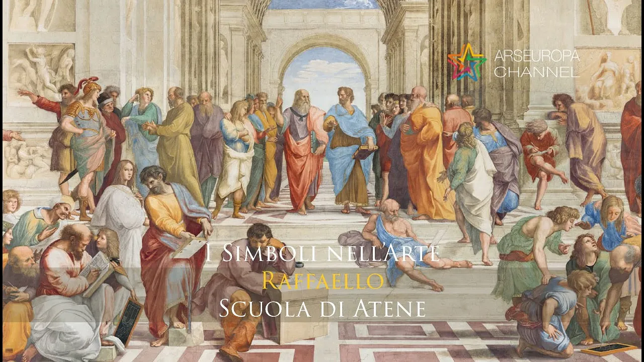 [Musica] 58 personaggi la maggior parte filosofi sullo sfondo di un architettura tardo antica discutono a gruppi su vari argomenti la fresco si basa su un antitesi fra il pensiero aristotelico e quello platonico che trova il suo equilibrio concetto evidenziato dai codici pro semi c dalle posizioni e dai gesti dei protagonisti infatti i due filosofi si trovano al centro della composizione a voler indicare che la verità abbia caratteristiche sintetiche di conciliazione tra quelle intuite dall'uno e dall'altro [Musica] platone raffigurato con il volto di leonardo da vinci regge il timeo e solleva il dito verso l'alto alludendo