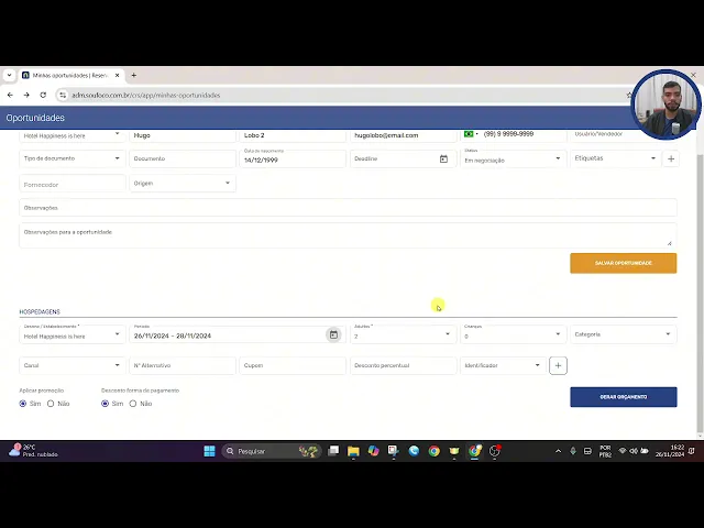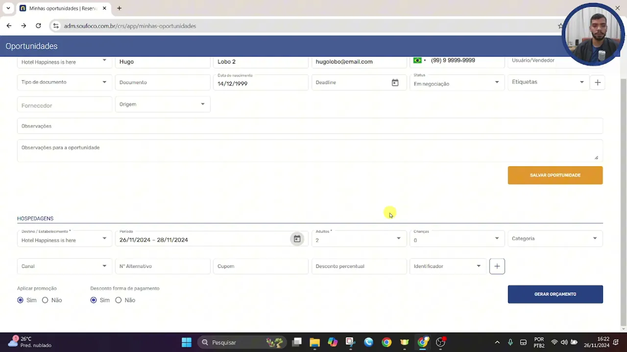 alterar para a partir do momento que a pessoa ela faz contato PR negociação e assim por diante de acordo com a etapa de compra podemos também editar essa oportunidade clicando no botão editar oportunidade ou até mesmo podemos aqui retornando ao painel excluir a oportunidade além da criação da oportunidade podemos também criar por meio desse esse painel um orçamento uma proposta para hóspedes e também para possíveis hóspedes para criar aqui um orçamento precisamos registrar os dados do responsável que serão utilizados caso o orçamento seja convertido em reserva Então vou inserir aqui os dados desse interessado vou