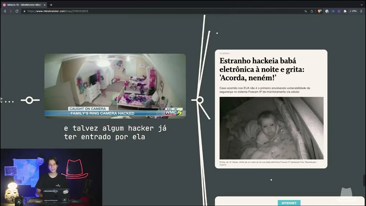 vez nessa notícia nesse outro exemplo aqui dessa notícia essa daqui foi uma câmera de segurança uma babá eletrônica de uma casa dos Estados Unidos e também foi hackeada e o hacker teve acesso às imagens conseguiu conversar com a criança e até tem uma notícia aqui mostrando que hackar webc é mais comum do que imagino ter webc hackeadas em casas locais públicos é mais comum do que aquelas coisas de filmes que a gente vê um hacker super mega poderoso que tem que ter um conhecimento absurdo para hackar elas não isso acontece muitas vezes muitas vezes para