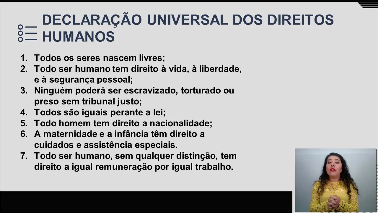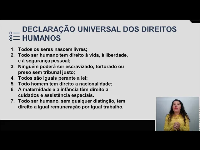 Prezados(as) discentes, essa legenda foi gerada automaticamente e em breve passará por revisão para ajustes ortográficos e gramaticais. Olá, essa disciplina, Políticas Sociais e Direitos Humanos, é sua aula "Declaração dos Direitos Humanos - Parte 2". Eu sou a Professora Gabriela Oliveira e vou estar com você nesse momento.