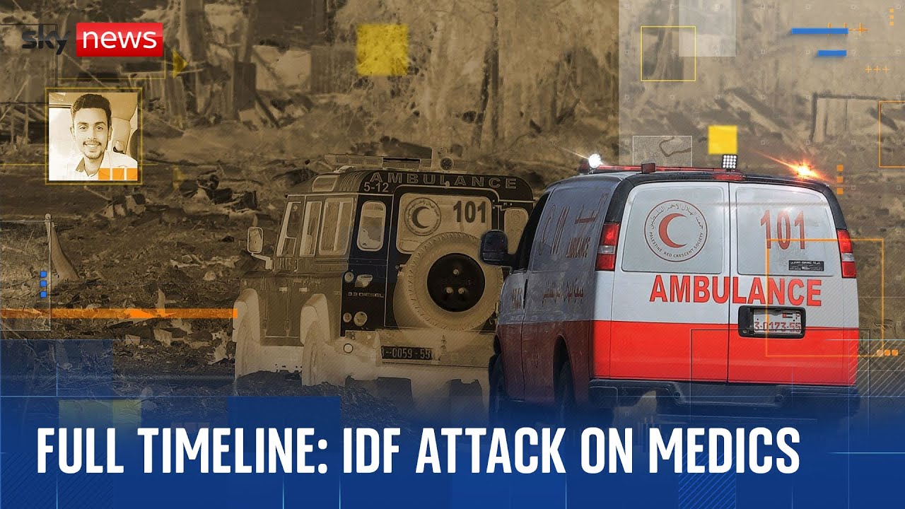 [Music] Israel says six of the paramedics it killed were also members of Hamas and it says it plans to name them. And at this afternoon's briefings briefing officials showed us aerial footage which indicated that several other vehicles including an ambulance were not shot at as they passed by in the hour between the first and second ambushes. proof.