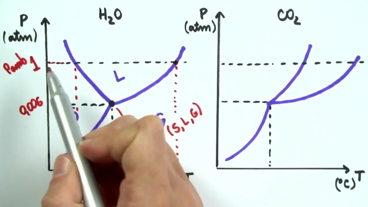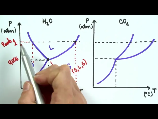 em cima dela nessas pressões e nessas temperaturas eh a gente tem coexistindo o estado líquido com o estado gasoso e o ponto triplo né ponto triplo ele é muito importante porque nele a gente tem a coexistência de estado sólido líquido e gasoso eu sei que é estranho a gente pensar assim né que está existindo ao mesmo tempo a mesma substância Ela tá no estado sólido líquido e gasoso mas sim isso acontece em pressões e temperaturas definidas como por exemplo com a água a água numa pressão de 0,006 atmosferas e numa temperatura de 0,01 g a