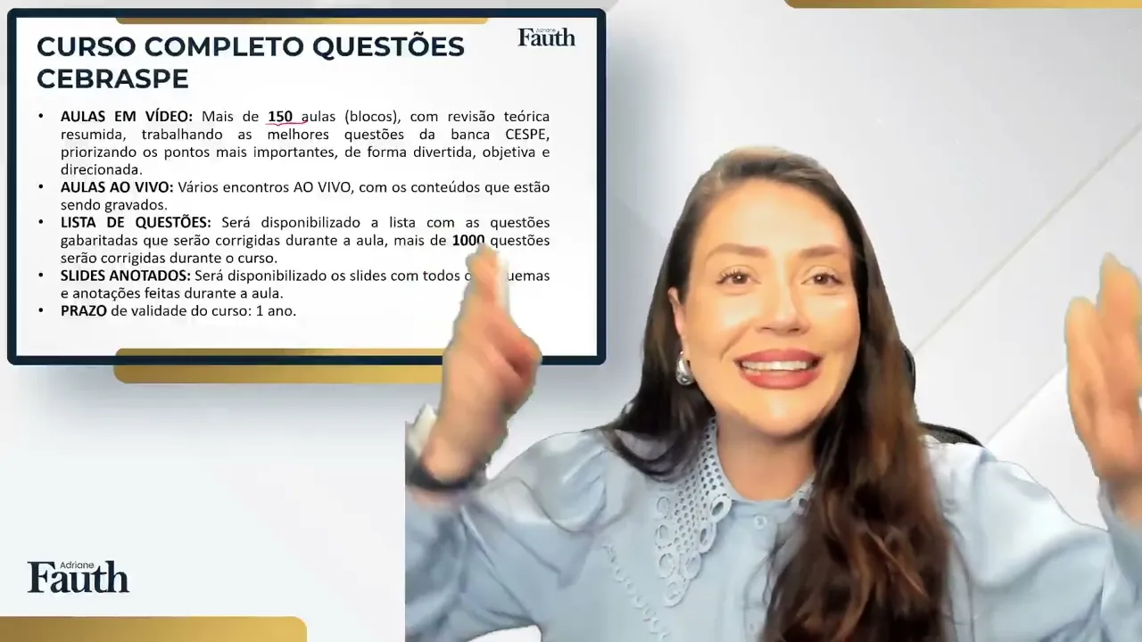 nesse curso nós fizemos mais de 1000 questões tá então existem a gente vai trabalhar mais de 1000 questões da banca Cesp durante esse curso quando eu falo mais de 1000 é bem mais que 1000 tá ainda você vai ter acesso aos slides anotados isso porque como eu disse nós temos uma breve revisão teórica às vezes dependendo da questão eu faço algum esqueminha para te ajudar na fixação e isso vai fazer diferença também aí na sua preparação Então você além da lista de questões você vai ter acesso a esses slides anotados com os esquemas prazo de