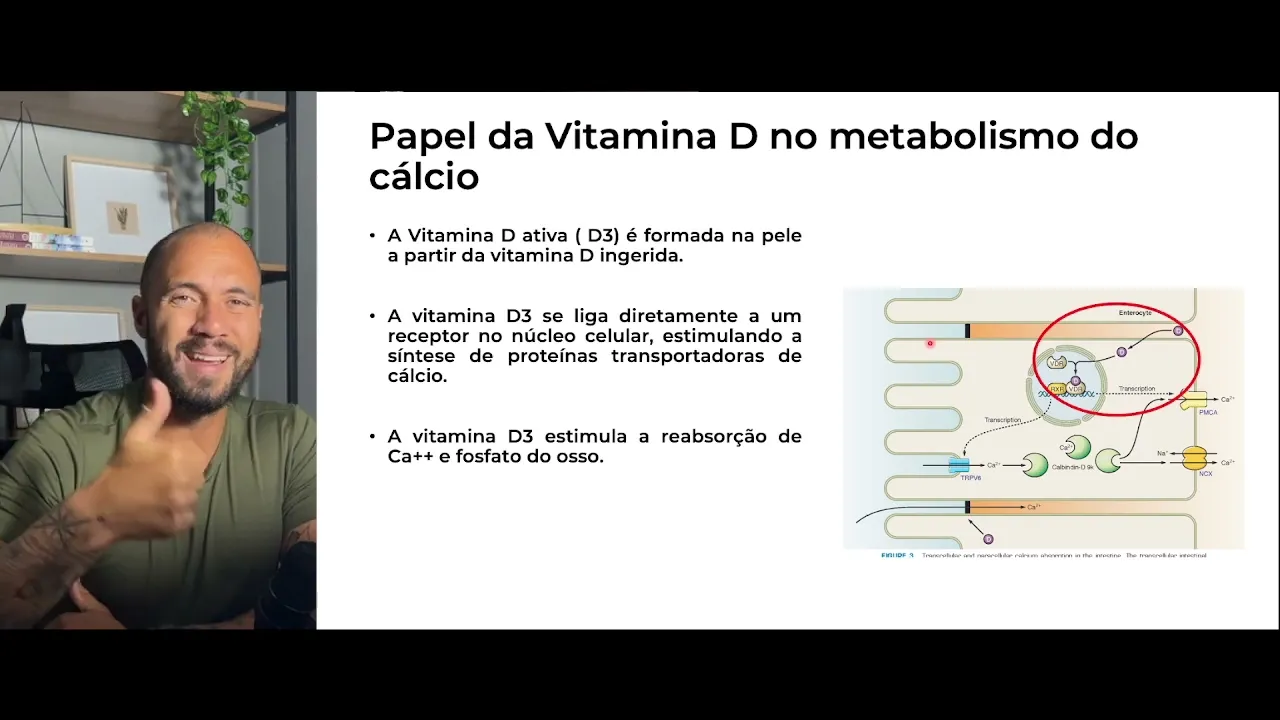do Lumen e eu tenho proteínas de transporte na membrana basolateral que é aquela que joga cálcio para fora fora do hós e dentro da nossa corrente sanguínea então a vitamina D influencia a expressão dessas duas proteínas aumenta a expressão de genes que vão ser transcritos nessas duas proteínas então cálcio é a absorção de cálcio é otimizada e melhorada na presença de vitamina D certo vitamina D é um é um é um nutriente importantíssimo No que diz respeito à homeostase ao metabolismo corporal de cálcio a gente pode dizer que tem três hormônios que regulam metabolismo corporal