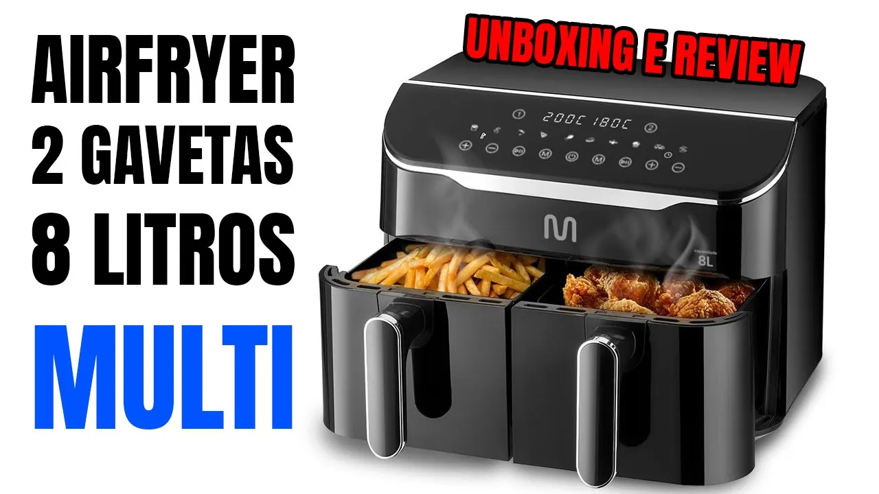 [Música] [Aplausos] Olá a todos sejam muito bem-vindos a mais um vídeo de unboxing aqui no canal essa nova Air Fry de duas gavetas da Multi porque a Multi Laser agora é multi Aqui nós já vemos algumas informações né como duas gavetas com capacidade total de 8 l 4 l por gaveta um display digital 100% e aqui me chamou atenção Olha só 2500 w de Potência em 220 V Gente eu nunca tinha visto uma airfry nemum forno airfry com essa potência absurda 2500 w Cara essa aqui deve ser muito rápida nos preparos né 90 minutos aqui