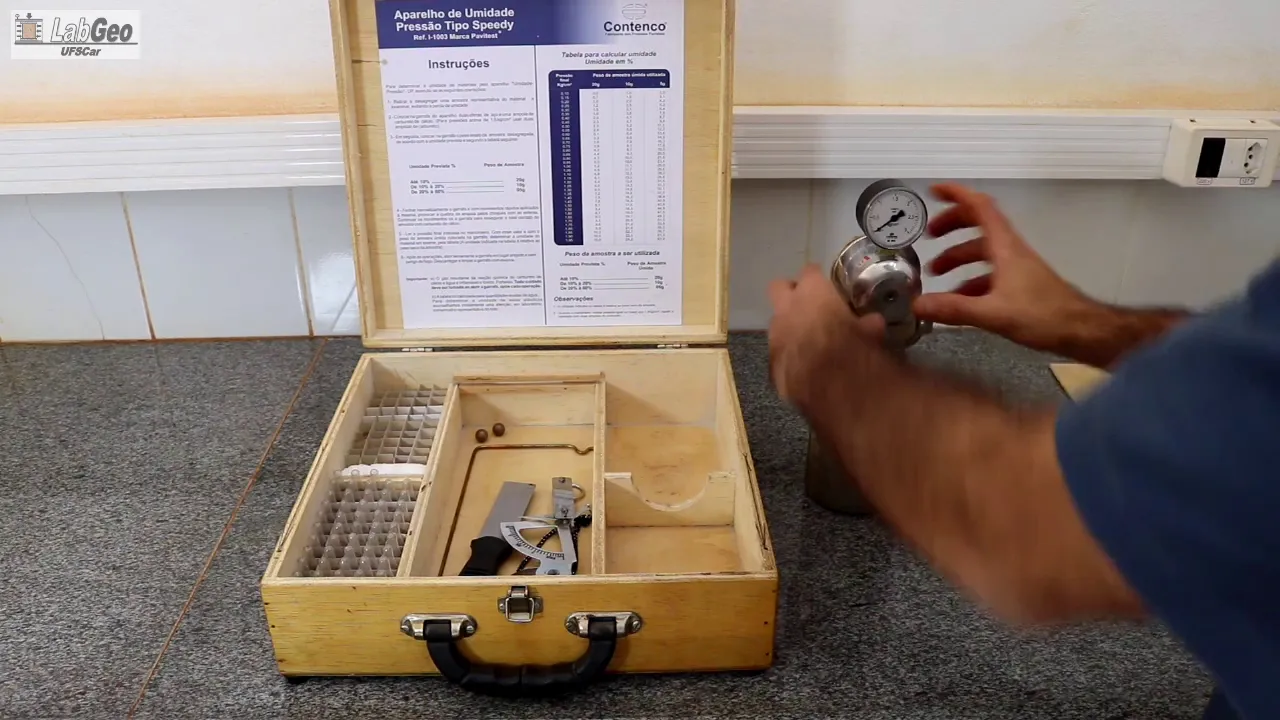 conjunto Speed e são introduzidos no conjunto as esferas metálicas é ampola de carbureto e a Copa se o manômetro na parte superior do conjunto que então agitado a ampola irá se quebrar eu carbureto de cálcio reagirá com a água presente no solo gerando uma pressão que é lida pelo manômetro mas a leitura da pressão é possível determinar o teor de umidade da amostra com uma tabela presente no equipamento onde a relação entre a massa da Morte ensaiada e o teor de umidade E aí