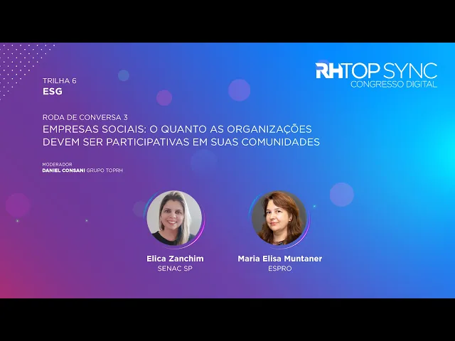 [Música] trilha 6 esg empresas sociais o quanto as organizações devem ser participativas em suas comunidades convidadas elica zanquim Senac São Paulo Maria Elisa montaner Espro moderador Daniel con Olá sejam bem-vindas e bem-vindos à roda de conversa número TRS da trilha 6 esg deste RH top 5 2024 que reúne as empresas e profissionais que conquistaram a indicação ao top of mind de RH deste ciclo de 2024 eu sou o Daniel consani CEO do grupo top RH e antes da gente começar eu vou me descrever Eu sou um homem branco de estatura mediana olhos castanhos cabelos eh