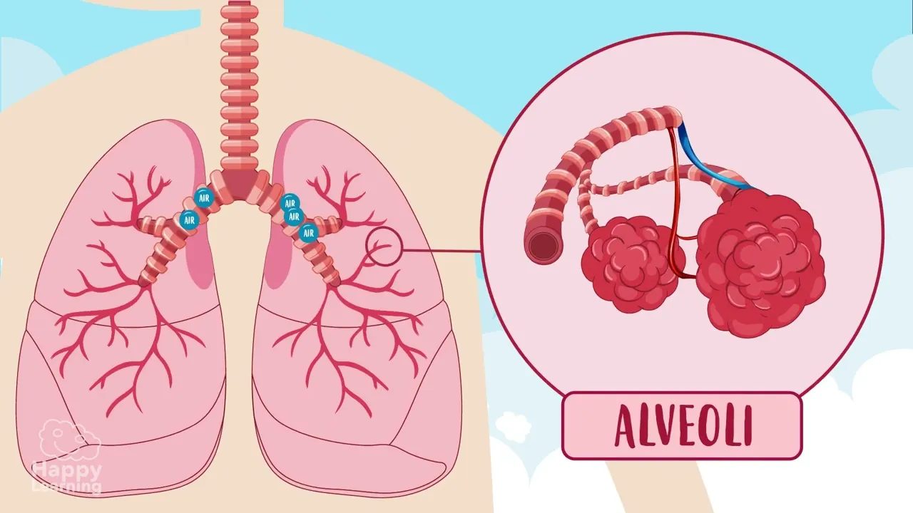 the broni the broni once inside the lungs Branch into narrower tubes called bronchials and each Broncho leads into many small sacks called alvioli and it is there in the alvioli where gas exchange takes place the oxygen in the air passes into the blood through some very small blood vessels which are called alvioli then what is left over from the air which is carbon dioxide travels back through the respiratory system to be expelled outside [Music] as you can see the respiratory system is very important so we have to take good care of it and for that