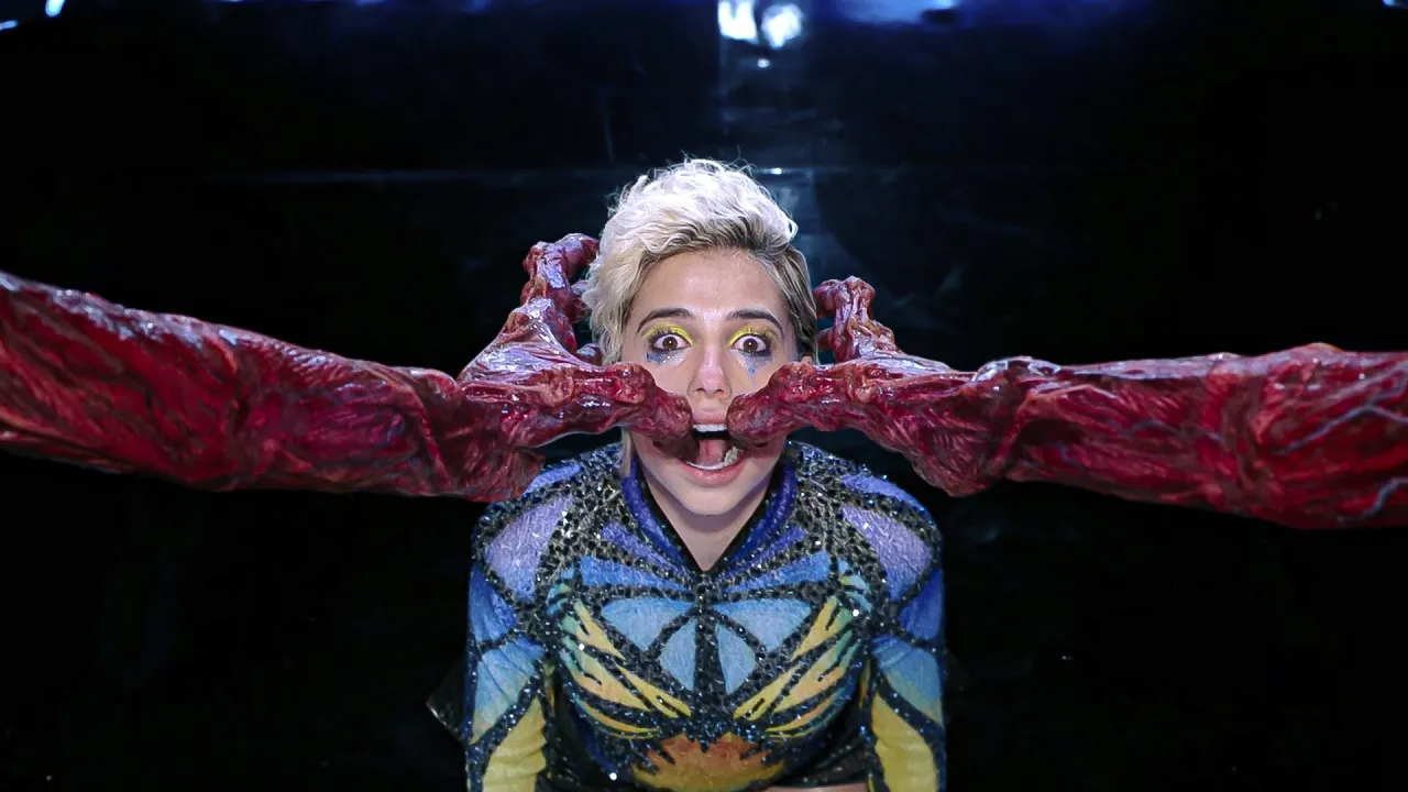 Alucinação no final do palco Sky vê a entidade que agora se parece exatamente com ela mas com um sorriso maligno em seguida o ser rasga a cicatriz no próprio estômago revelando sua verdadeira forma uma criatura aterrorizante esguia sem pele e com olhos saltados sem forças e derrotada Sky cai de de joelhos e o Monstro força sua boca a se abrir com suas mãos enormes enquanto isso tudo o que o público vê é a cantora sufocando o que provoca murmúrios preocupados na multidão segundos depois a cantora se levanta e quando se vira para os fãs seu