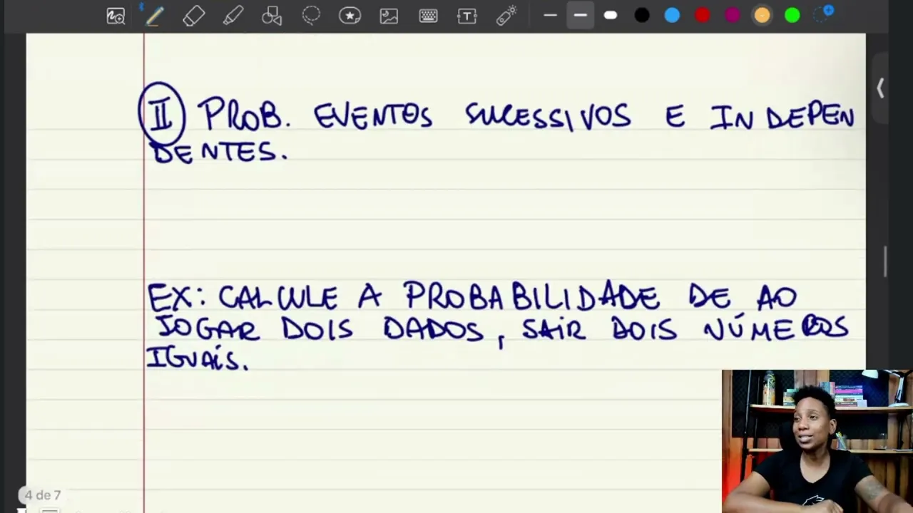 da mesma cor Ou seja eu preciso que seja vermelha e vermelha eu tô falando isso para vocês gente porque geralmente esse caso muit das vezes você tem que pensar nisso né A questão não vai falar isso para você então você tem que pensar nisso tá então fiquem atentos a esse caso é o caso que mais aparece então vamos fazer um exemplo ó calcule a probabilidade de Ao jogar o dado duas vezes né jogar o dado duas vezes sair dois números igis situação bastante comum vamos lá vamos pensar vamos primeiro pensar numa situação pequena quando eu