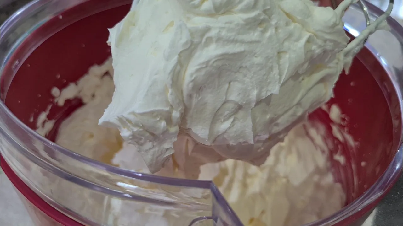 que vocês vão adorar agora eu vou mostrar para vocês misturando com um pouco de recheio como que fica a textura vamos lá Então vamos lá aqui eu tenho a nossa nata com chantilly que nós acabamos de bater olha a cor que fica que linda que é ainda aqui não tá mostrando a cor mesmo original por causa das luzes que eu uso aqui para filmagem mas eu garanto para vocês que a cor é perfeita eu coloquei aqui três colheres de sopa que nós acabamos de bater e eu vou utilizar aqui a nossa ganache de abacaxi vou