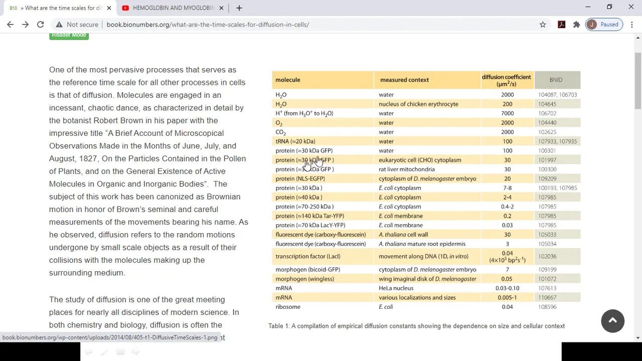o oxigênio tem uma difusão limitada é isso que você consegue ver nesse site esse site ele fala sobre várias Situações aí de difusão Então esse daqui é água eu tô olhando uma molécula de água no uma num balde de água por exemplo essa molécula vai ter um coeficiente de difusão D 2000 micro metros por segundo e isso é a mesma molécula de água no núcleo de um Ele trouxe de um glóbulo vermelho de frango de galináceos Olha só do dez vezes mais lento a difusão né então esse já te dá uma pista de que esse