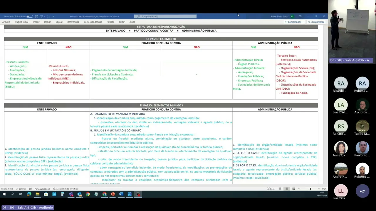 tentar preencher a planilha que foi enviada junto com o exercício com os campos que a gente colocou esses campos aí né se tem ente privado se tem Interposto da pessoa se praticou conduta contra a administração e quem é a administração pública tá e depois embaixo o ente privado qual conduta Então vamos nos empenhar aí 15 minutinhos tá pessoal P eh deixa Deixa eu só dar um uma informação para vocês eh esse template essas informações que vocês estão utilizando aqui isso aí vai ser fase vai ser objeto de discussão no que eu falei de manhã aqui