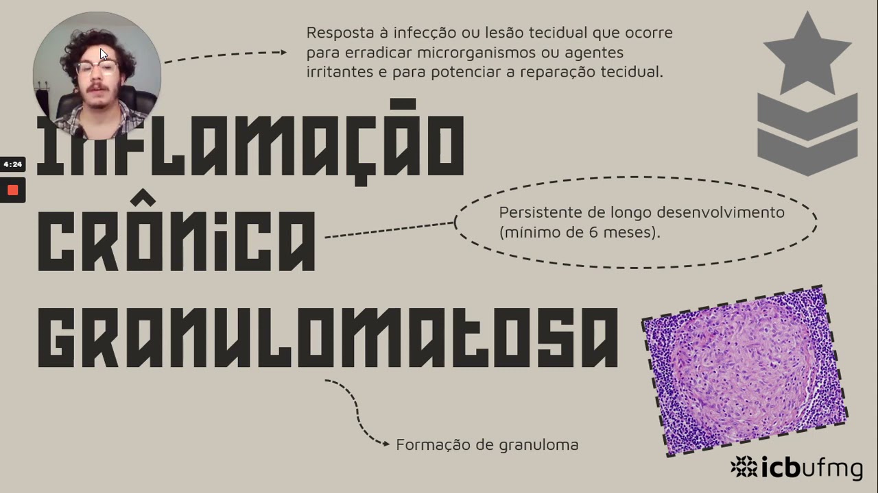 inflamação aguda pode acessar nosso vídeo que está disponível por aqui é a inflamação crônica caracteriza-se por uma inflamação de duração prolongada por semanas meses ou até anos com a predominância dos fenômenos de destruição tecidual e reparação ocorrendo simultaneamente é observado a predominância de células mononucleares como uma acrofagos linfócitos e plasmócitos além da proliferação de fibroblastos e osteoblastos que a angiogênese a transição da inflamação aguda para a inflamação crônica é variável e a duração da inflamação crônica está relacionada à persistência da presença do agente agressor e as causas que estão mais comumente associadas a infecções persistentes