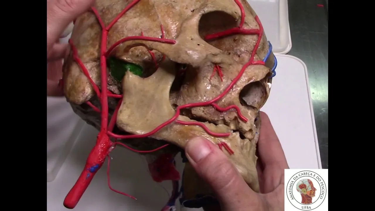 da mandíbula e ela vai formar vários ramos ela Supre dentes inferiores superiores cavidade nasal seio maxilar mu a ligação então a Fera bastante complexo eu vou tentar mostrar alguns desses nomes aqui na maquete e aqui a gente vê por exemplo e olhando aqui nessa maquete a gente vê aqui ó essa aqui tão as artérias temporais Profundas que sofreu músculo temporal e que vem também na maxilar né a gente vê aqui ó saindo da maxilar hoje a gente veio aqui ó artéria entrou Vital também o ramo da artéria maxilar que passa aqui dentro da do canal