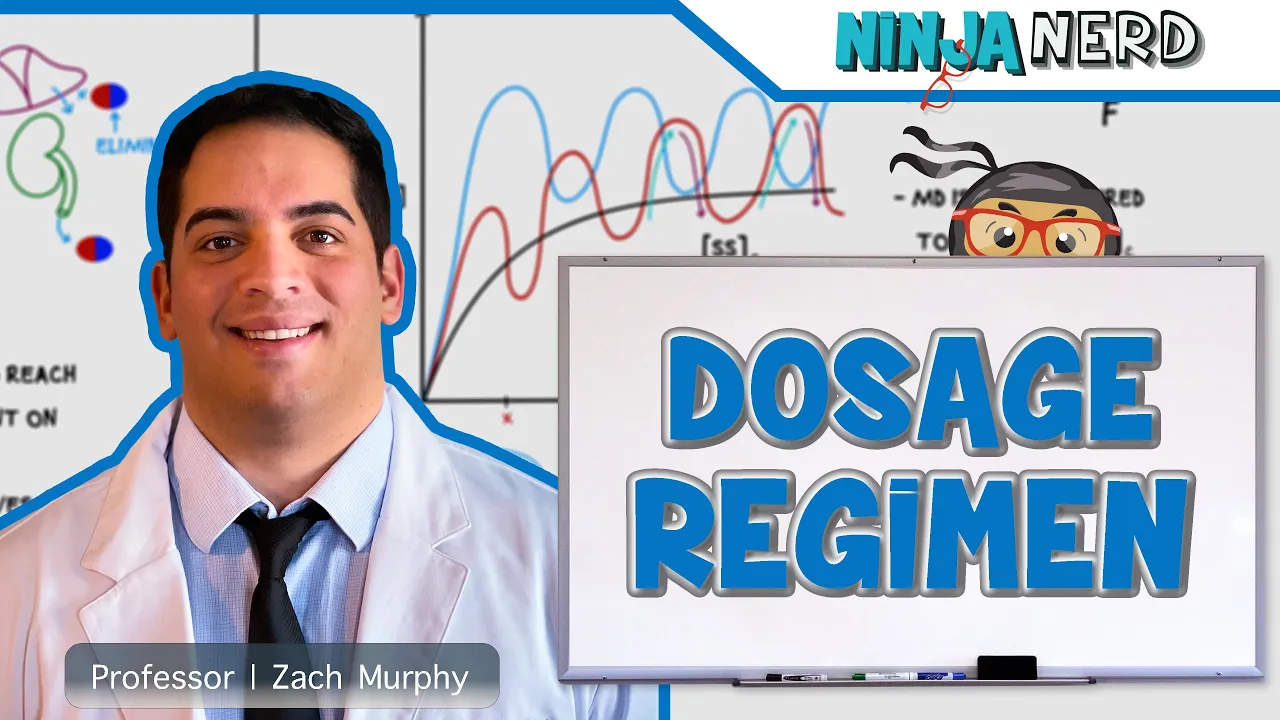all right so the last thing that's important for pharmacokinetics is being able to design and optimize a dosage regimen this is really kind of like the crux of pharmacokinetics so whenever you're talking about giving a particular dosage regimen it's really important because it talks about three particular things what's the dose of the drug that i'm going to give what's the dosing interval so how frequently am i going to be able to give this drug is it going to be once a day is it going to be twice a day is it going to be three times a day and then what's the best route of administration to give this drug if i'm giving a po versus if i'm giving it iv and when we construct a particular type of dosage regimen we can think about the easiest one one of the easy ones of being able to accomplish perfect therapeutic concentrations without having to really think and get complicated with respect to the dose the dosing interval which route it's actually really easy whenever you have a continuous infusion because continuous infusions the route of administration is iv the the dose that we give it obviously depends upon what type of effect we're trying to achieve and in the dosing interval it's obviously going to be particularly the constant and so when we talk about continuous infusions what do we kind of see with our graph here it's really really cool so what happens is when you look at the graph of a continuous infusion is as you try to increase the concentration of the drug so it's basically if i'm putting somebody on a cardipine infusion for blood pressure i'm trying to target a particular blood pressure i want their systolic blood pressure less than 140. so titrate the actual drug the dosage per unit time based upon that that goal getting their blood pressure less than 140 millimeters mercury systolic and so what you have to do is is you'll start seeing that maybe the patient requires more drug and you increase the drug concentration over time and over time and it starts to get to a peak peak peak and once you reach that peak plasma concentration what you'll notice is is that if you stop giving the drug right you just eventually said okay turn the infusion off what would you notice about the concentration it would eventually start falling off and it would become eliminated well the drug administration and dosing is starting to go up up up up up guess what else is occurring at the same time as i'm giving this drug so as this drug is being pushed into the circulation increasing the concentration of the drug inside of the actual bloodstream guess what else is happening with the drug the drug is going to the liver it's actually being metabolized it's also going to the kidneys and it's being excreted so the elimination of the drug is going to start doing what the elimination is going to start increasing and then what you'll start seeing is the concentration of the drug decreasing but whenever you have a patient on a continuous infusion what you'll notice is you'll get to a perfect point where the dosing of the drug starts to become equivalent to the elimination of the drug so you get them to a particular concentration of the drug where their dosing rate so the rate at which you're delivering administering the drug becomes perfectly equal to their elimination rate so there's not basically it's like an equilibrium so the amount of drug that's coming in is equal to the amount of drug that's being eliminated from the body and because of that what will i notice i'll notice this kind of plateau this steady state if you will that the concentration of the drugs remains about the same because my dosing rate the rate that i'm giving the drug maybe it's at 15 milligrams you know per minute or whatever and the elimination rate is equal to that and so i'm eliminating the same amount of drug that's actually coming into the systemic circulation and that's a beautiful concept because once we get to this point where the concentration of the drug is kind of staying the same where the dosing rate is equivalent to the elimination rate that's a very particular time you know what this is called you know what this concentration is where we hit this particular state this is called your steady state concentration so it's called your steady state concentration so the steady state concentration is the concentration at which the dosing rate is equivalent to the elimination rate now here's what you may be asked on the exam what is the time that it takes to be able to get you to steady state concentration how much time does it take to be able to reach steady state concentration of the drug well this comes back to half-life and if you guys remember we said that whenever we're trying to eliminate so if we would e for eliminate when we eliminate it took four to five half-lifes to be able to eliminate how much of the drug 95 of the drug the same thing is to be able to reach steady state concentration it takes about four to five half-lives to be able to get it to the concentration inside of the actual bloodstream where it's equal to the amount that's being eliminated so the time required to reach your steady state concentration is heavily dependent upon the half-life and the amount of half-lives it takes to be able to reach steady-state concentration is about four to five half-lifes that's what i want you guys to remember so it takes four to five half-lives to eliminate 95 of the drug but it also takes four to five half-lives to reach a steady-state concentration of the drug which is where the dosing rate is equal to the elimination rate boom roasted now the concentration that we basically approach our reach when we hit steady state so whenever the dosing rate is equivalent to the elimination rate has nothing to do with the half-life the actual drug concentration i could let's say i was at 10 milligrams per minute and i finally reached steady state at 10 milligrams per minute let's say i wanted to increase the concentration of the dru