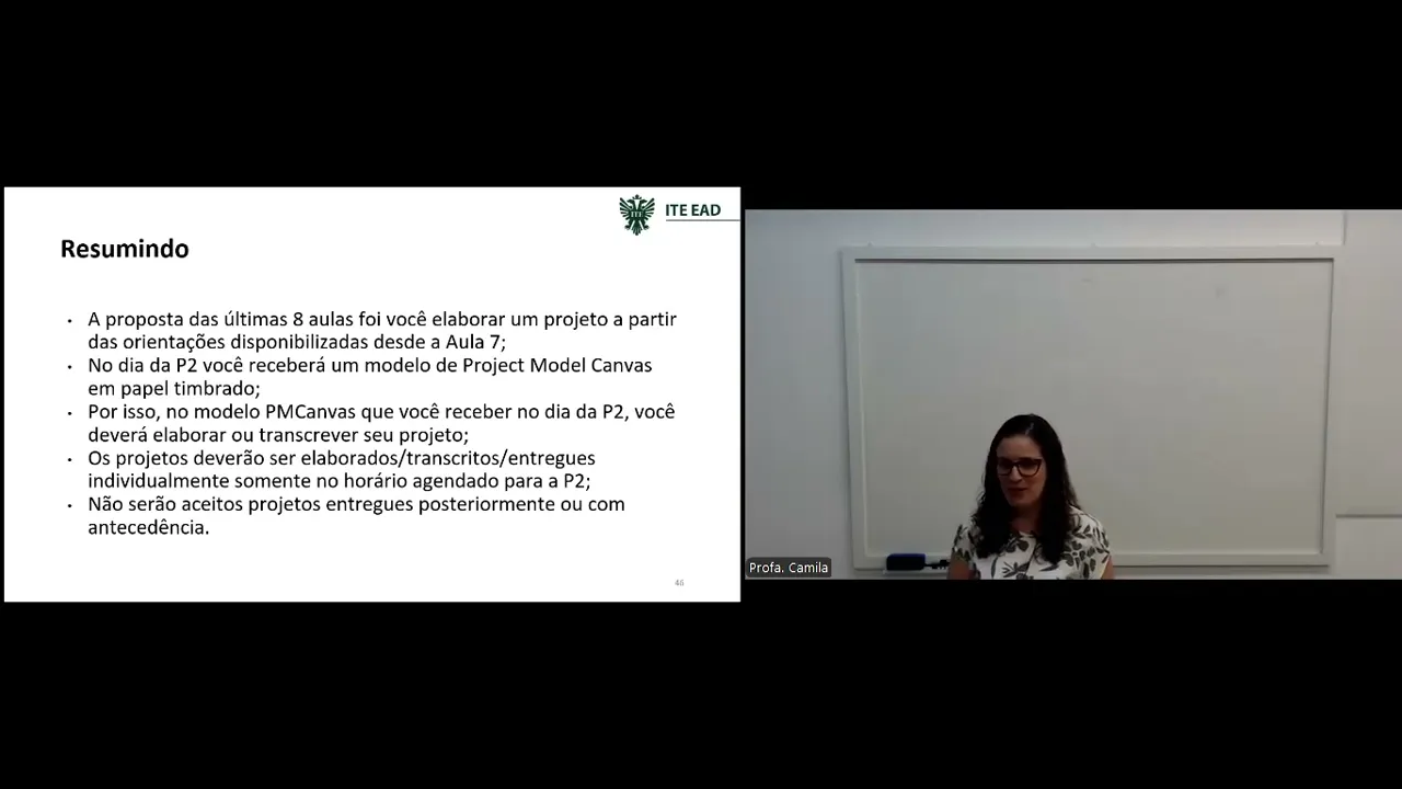 ser concluído talvez até dentro do prazo a gestão do tempo desse projeto e por fim da aula anterior conversamos sobre a forma de pontuar estes custos Resumindo a proposta dessas últimas Oito aulas foi você elaborar um projeto a partir das orientações disponibilizadas desde a aula 7 então se você assistiu toda a sequência até a aula oo para elaborar a nossa P1 a partir da aula 7 você também começou a receber orientações para que a gente possa realizar a P2 então a elaboração do project Model Canvas ela acontece em toda essa trajetória no dia da P2