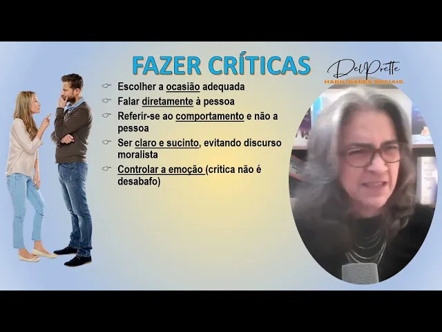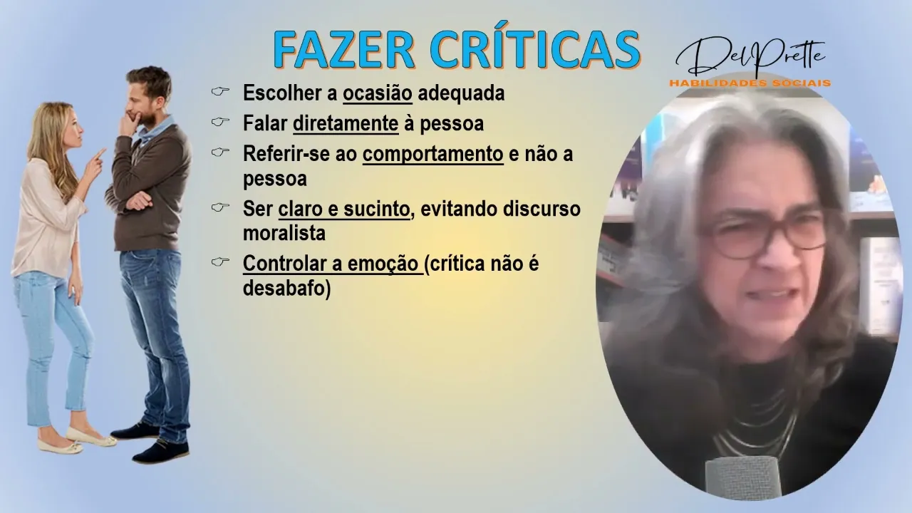 conteúdo ele é um fato ou é uma suposição ele tem a ver com a veracidade eh o segundo item a forma como expressar ou como foi Expressa em relação a nós Esse aspecto é crítico porque ele serve de base para aceitar ou rejeitar e também é um critério para fazermos boas críticas e o terceiro é o quando onde a quem eu posso expressar a minha crítica para que ela seja de fato pertinente adequada socialmente competente sim eu devo ser socialmente competente na habilidade de fazer de rejeitar e de aceitar críticas e Olha esses aspectos aí
