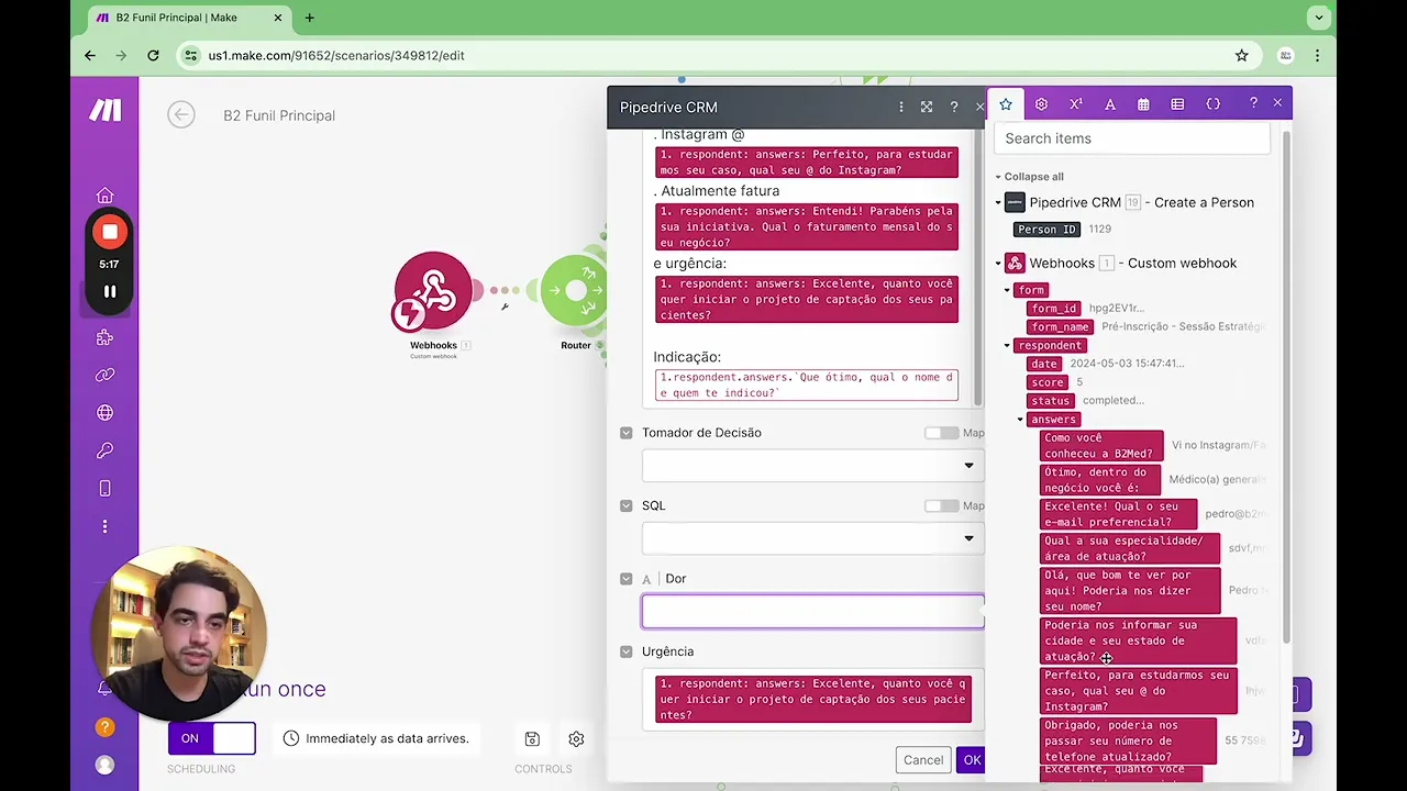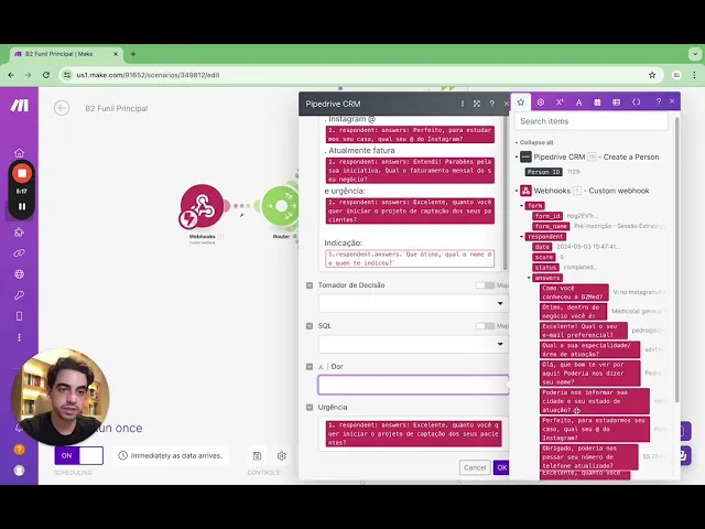 associa o Lead a pessoa então fica tudo integrado num local só então você cria a pessoa depois você cria um outro roteamento para você criar um negócio e um lead ao mesmo tempo e aí quando você o faz aqui em pessoa você vai puxar todas as informações você vai clicar uma vez que você conectou o Web Hook você criou o o campo do Pipe você clica em rodar E aí você responde esse questionário E aí você vai ter várias respostas e aí você vai preenchendo o nome vai ser com a parte de qual é seu