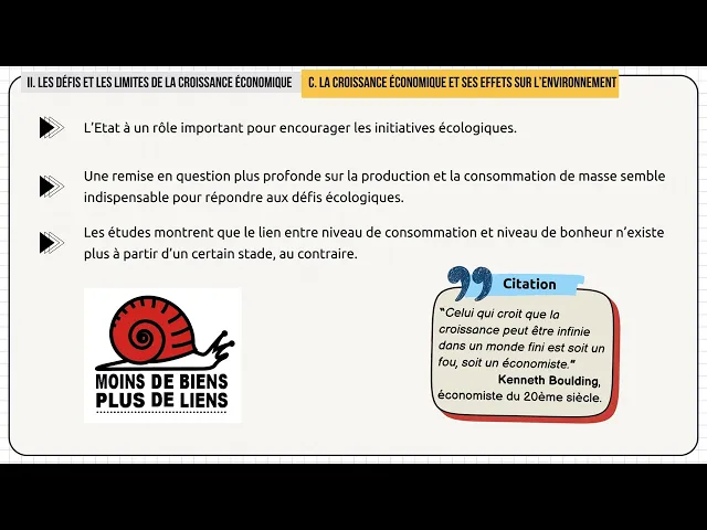celui qui croit que la croissance peut être infinie dans un monde fini et soit un fou soit un économique ça c'est une citation de Kenth buling qui est un économiste du 20e siècle si tu as un sujet sur l'environnement et la croissance économique je te conseille de le mettre en amorce ou en conclusion je t'assure que ça fera son petit effet alors je te fais un récap rapide des points que tu dois absolument maîtriser par rapport à cette partie sur les défis et les limites de la croissance économique tu dois te souvenir que la croissance