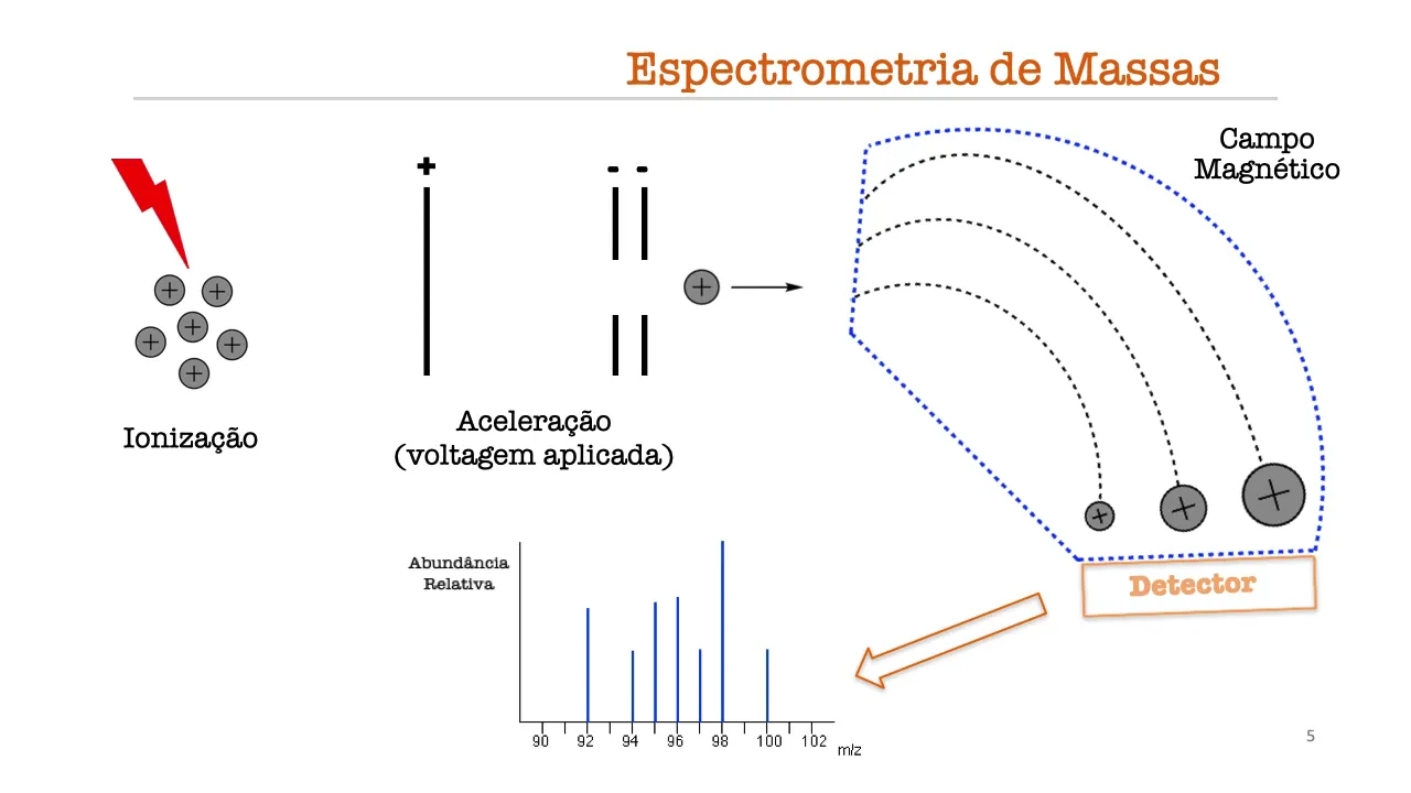 de materiais conhecidos na elucidação de propriedades químicas e estruturais das moléculas para determinação da massa de alguns compostos na análise do sequenciamento de proteínas e peptídeos por exemplo na Indústria Farmacêutica nas etapas de controle de qualidade e outras etapas clinicamente pode ser utilizada para análise de hemoglobina teste para verificação de drogas entre outros exames para melhor entender a técnica iniciemos com uma visão geral dos constituintes de um equipamento de massas ele possui grosseiramente cinco componentes o primeiro é o compartimento de entrada da amostra que faz a amostra entrar em contato com a pressão reduzida dentro