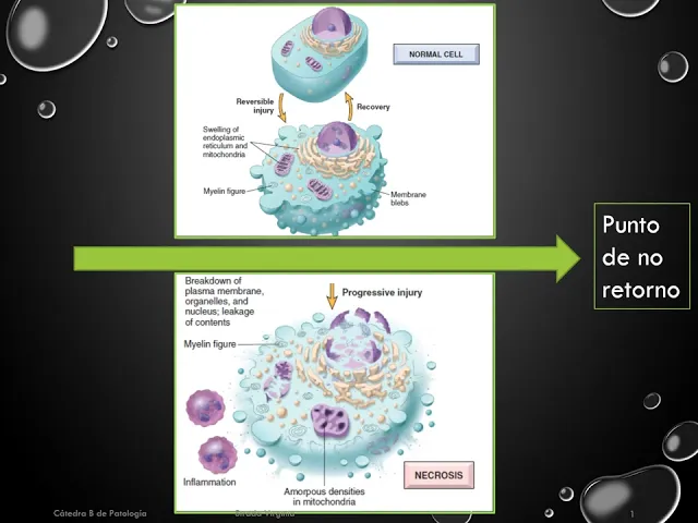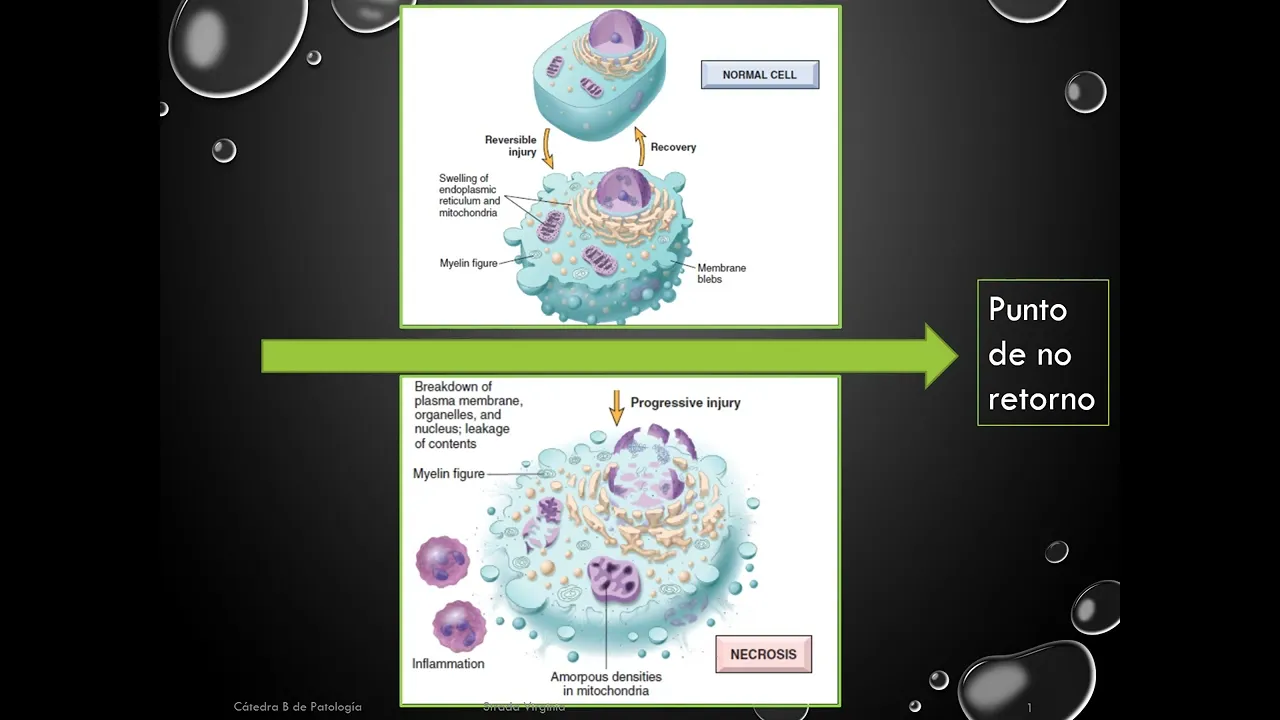 la fosforilación oxidativa en la importante entrada de calcio hace que se fragmente las membranas celulares se libere el contenido enzimático de los lisosomas y se altera todos los componentes celulares hace que se genere una célula que está necrótica Y esa célula necrótica esto es importante y lo vuelvo a repetir origina una respuesta inflamatoria por parte del tejido circular hasta ahora hemos mencionado Ya varias veces la palabra necrosis ahora vamos a definir necrosis es la muerte celular lítica no programada sino accidental producida por una injuria que lleva a la desnaturalización de las proteínas y la digestión