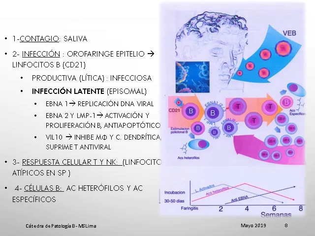sea por hb o por otras causas el virus es más probable que genera la enfermedad y en muchas de las situaciones genera proliferación es neoplásicas de los linfocitos lo cual es bastante frecuentemente [Música] la forma de contagio de esta enfermedad es la saliva en su ingreso a la obra faringe el virus infecta el epitelio y luego ingresa a los linfocitos b de las amígdalas y adenoides por vía del receptor sede 21 dentro del linfocito vez se replica y puede avisar a la célula para continuar infectando otros linfocitos b a eso se le denomina la infección